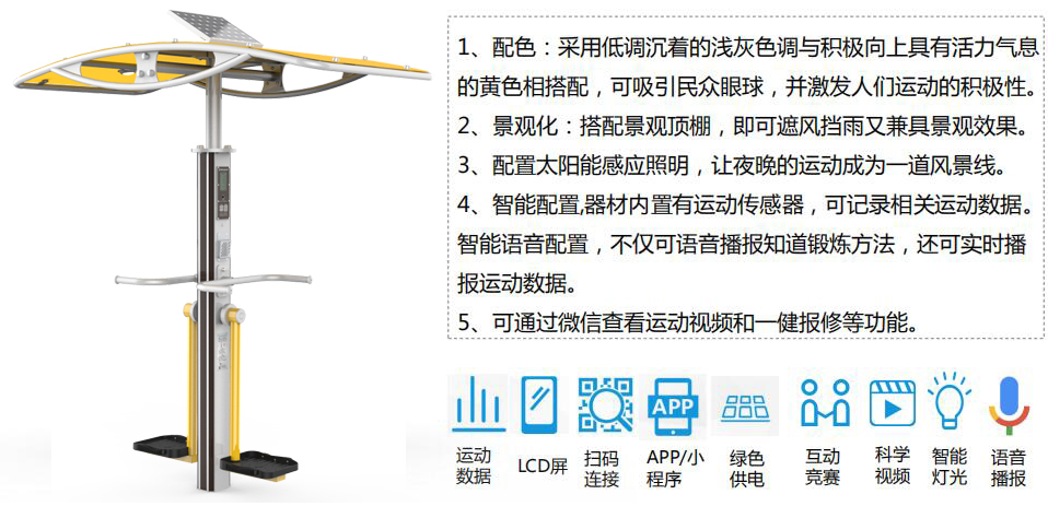 huatihui全民健身产品涵盖健身路径、运动场馆、篮乒气羽排等产品,分为多个系列,先进的制造工艺、严苛的质量检测,确保产品性能优良、品质安全可靠,让运动简单科学。并将全民健身器材(户外路径器材、体育场馆等产品)进行智能化升级和互联,实现全人群覆盖、全场景智能,让运动赞美生活。