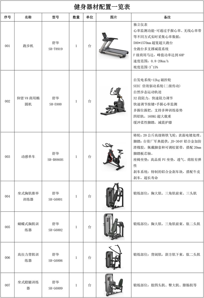 1.huatihuiV9智能跑步机SH-T8919*5台-独立仪表-简洁大气,全新外观设计,健康运动新选择;心率监测功能,可通过手握心率、无线心率带等不同方式实时采集心率数据;580*1570mm超宽超大跑台-跑感舒适,跑台整体安全稳定;全跑台多支撑减震平台,保证跑台超强支撑力,达到180kg支撑,满足专业健身房需求。F级商用马达-超强马达,AC 3.0HP 交流,峰值功率达到6HP,F级商用品质。速度范围达到0.8-20km/h;V9跑步机可实现跑台扬升功能,坡度范围-3~15%,满足客户不同的锻炼需求。