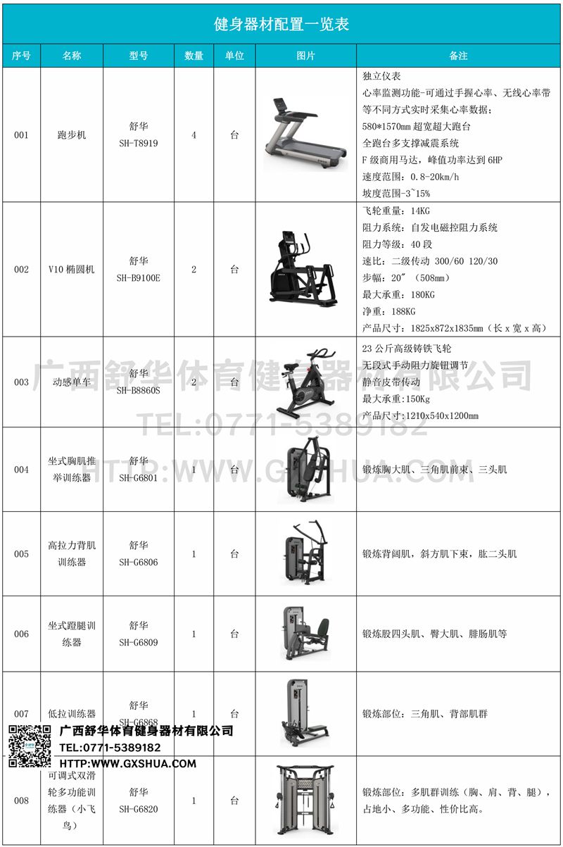 1.huatihuiV9跑步机SH-T8919*4台-580*1570mm超宽超大跑台-跑感舒适,跑台整体安全稳定;全跑台多支撑减震平台,保证跑台超强支撑力,达到180kg支撑,满足专业健身房需求。F级商用马达-超强马达,AC 3.0HP 交流,峰值功率达到6HP,F级商用品质。速度范围达到0.8-20km/h;V9跑步机可实现跑台扬升功能,坡度范围-3~15%,满足客户不同的锻炼需求。
