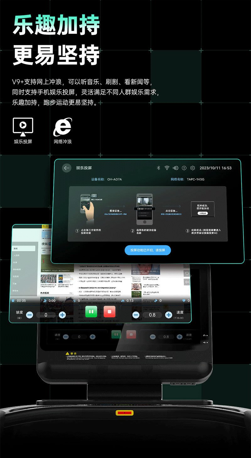 室内健身器材-huatihui跑步机系列分为X系列、A系列、B系列,主要有V9高端跑步机、X6心率版跑步机、X5高端家用跑步机、X3智能跑步机、A5折叠跑步机等多款智能家用跑步机,融入微信互联、阿里智能、智能触屏、专利减震等多项专业技术与智能科技,充分满足不同运动爱好者的需求,让跑步更科学、更简单!