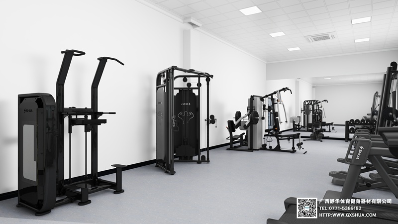 3.huatihui四人站综合训练器SH-G5205*1台-主要训练功能:推胸、蝴蝶夹胸、哈克深蹲、双杠、高拉、勾脚、悬垂举腿、坐姿划船、蹬腿;一机四位多用途,减小占地 面积的同时,可满足四个用户同时 使用,而无需购买4台产品,大大 的提升了产品的性价比及功能性。 涵盖上肢、下肢、胸、臀、核心肌 肉群等肌群的锻炼,结合随机附带 配件,可组合多种训练方式,充分训练人体各处肌群。适用于是小型工作室、企事业健身房等。