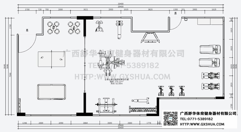 177m²企事业单位健身房根据场地、职工需求、整体预算,有氧器材区域配置huatihui跑步机2台,椭圆机2台、动感单车3台,满足职工的日常有氧训练需求,有效地提升心肺功能;