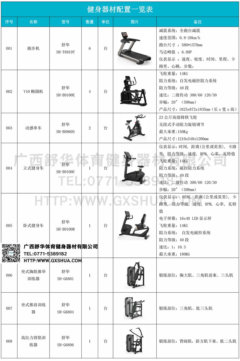 1.huatihuiV9跑步机SH-T8919T*6台-V9+采用全跑台减震设计,为跑者提供舒适的落脚地感和稳定的跑步支撑,良好的缓冲防护,降低膝关节受伤风险。商用大跑台,为跑者提供从容奔跑空间,180kg承载力,580*1570纯跑台面积,满足专业健身需求。V9+采用F级商用马达,6HP峰值马力,20km/h最高速度,提供源源不断的动力。V9+内置健身直播软件,每周提供直播课程,内含大量专业线上健身点播课程,可为健身房不同人群提供多样化健身课程服务。