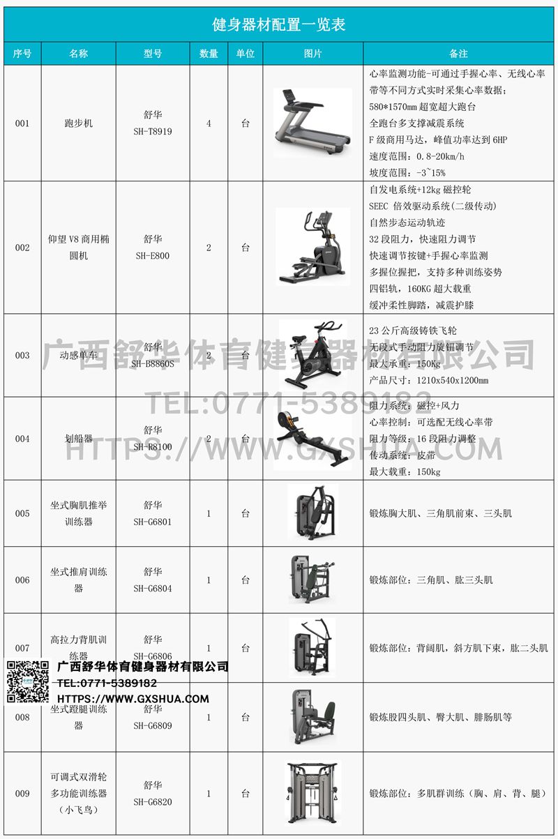 1.huatihuiV9跑步机SH-T8919*4台-580*1570mm超宽超大跑台,全跑台多支撑减震平台,保证跑台超强支撑力,达到180kg支撑,满足专业健身房需求。F级商用马达-超强马达,AC 3.0HP 交流,峰值功率达到6HP,F级商用品质。速度范围达到0.8-20km/h;V9跑步机可实现跑台扬升功能,坡度范围-3~15%,满足客户不同的锻炼需求。