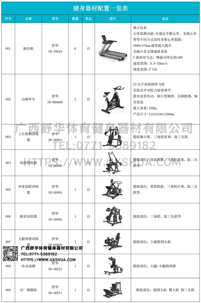 1.huatihuiV9跑步机SH-T8919*6台-580*1570mm超宽超大跑台-跑感舒适,跑台整体安全稳定;全跑台多支撑减震平台,保证跑台超强支撑力,达到180kg支撑,满足专业健身房需求。F级商用马达-超强马达,AC 3.0HP 交流,峰值功率达到6HP,F级商用品质。速度范围达到0.8-20km/h;V9跑步机可实现跑台扬升功能,坡度范围-3~15%,满足客户不同的锻炼需求。